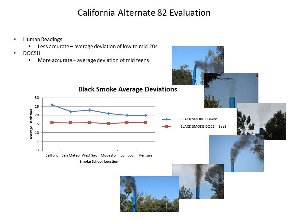 • DOCS II SaaS operators achieved an average standard deviation of 16 across all smoke schools. The human Standard deviation was consistently > 20. • DOCS II operators never failed a certification run • DOCS II operators matched the transmissometer 46% of the time. • DOCS II operators were within one deviation 47% of the time. • DOCS II operators were within 2 deviation points 6% of the time. • Within 3 deviation points only 1% of the time. • DOCS II SaaS met the requirements of EPA Alt. 082.